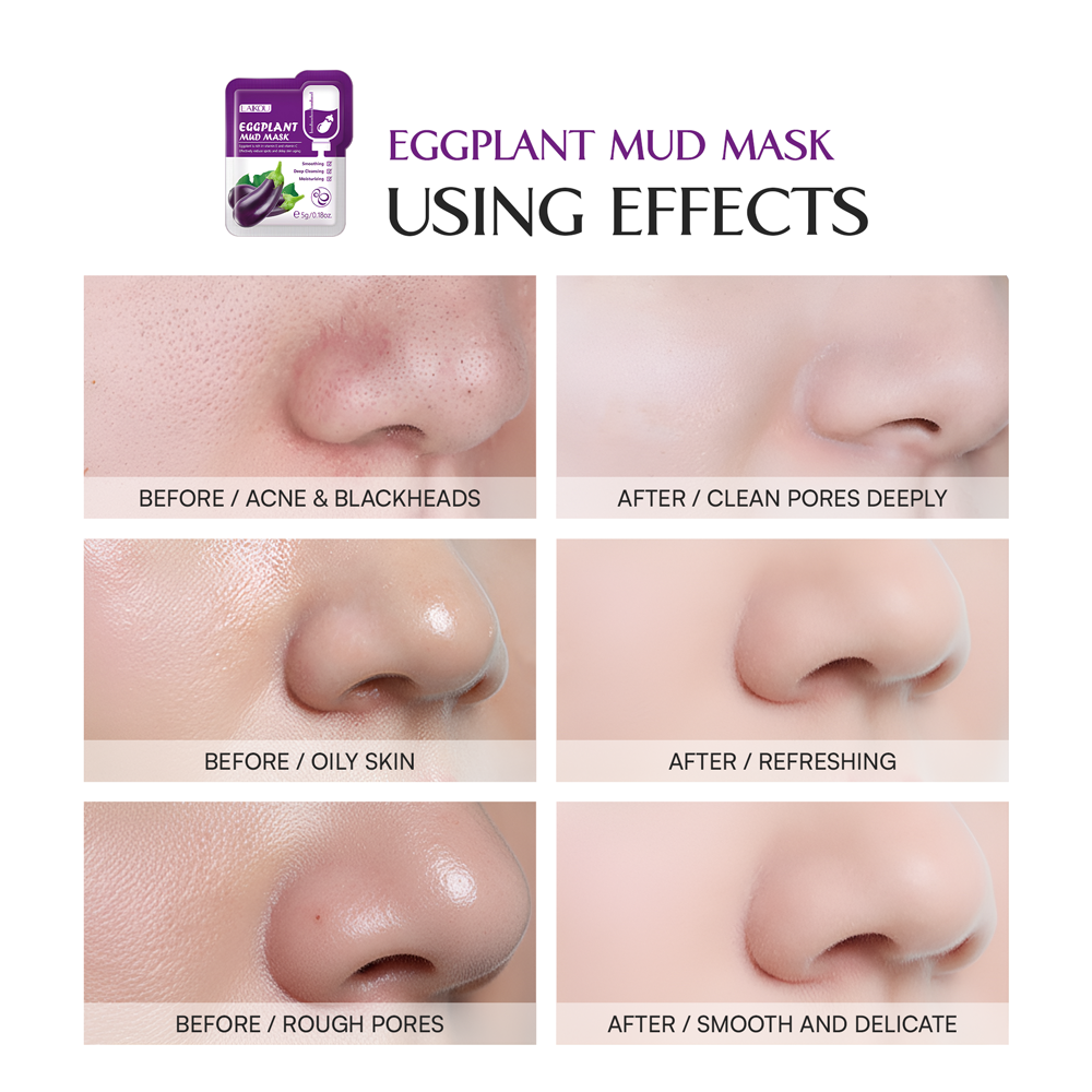 Eggplant Mud Mask | Smoothing, Deep Cleansing, Anti-Aging | Rich in **Vitamin E & C** | Soothes acne, firms the skin, and works to **reduce spots and delay signs of aging**. Reveals a brighter, younger-looking complexion. |