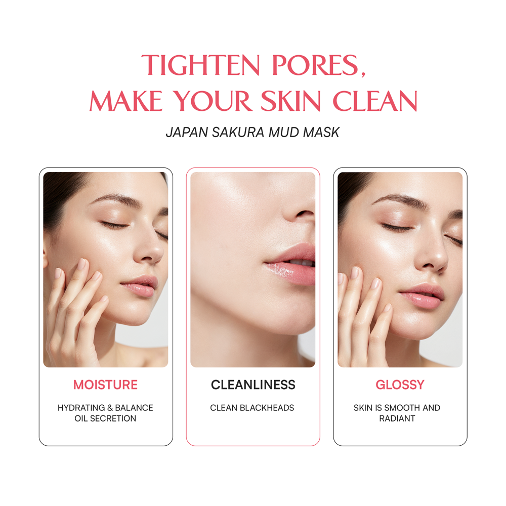Sakura Mud Mask | Pore Cleansing, Hydrating, Oil Balance | **Sakura (Cherry Blossom) Extract** | Rejuvenates skin, **shrinks pores**, and balances oil. Helps to remove aged keratin for a **rosy, soft, and smooth finish**. |