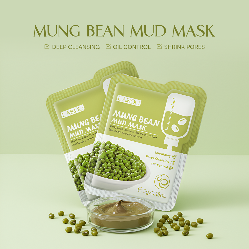 Mung Bean Mud Mask | Smoothing, Pores Cleansing, Oil Control | **Mung Bean Extract** | Deeply cleanses to **reduce blackheads** and remove excess oil. Leaves the skin feeling **soft and refined**. |