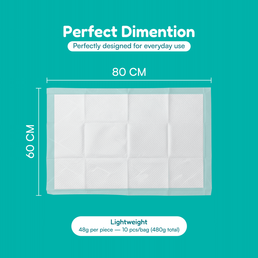 Introducing your set of 10 disposable underpads, the perfect solution for protecting bedding and furniture from leaks and spills. Each pad measures 60 x 80 cm, a convenient size for versatile use. Designed for reliability, each piece weighs a substantial 48g, totaling a solid 480g per 10-piece bag, ensuring excellent quality and absorbency. A key feature of this set is the inclusion of an adhesive strip on each pad, which secures it firmly in place on sheets or surfaces, preventing frustrating slippage throughout the night or during changes. These pads are an essential item for parents, providing an extra layer of protection under a baby at night to catch any diaper leaks, or serving as a clean, hygienic surface when changing diapers while away from home. Their practical design and generous size also make them an invaluable aid for the daily care of the elderly, offering dignified and effective protection against incontinence.